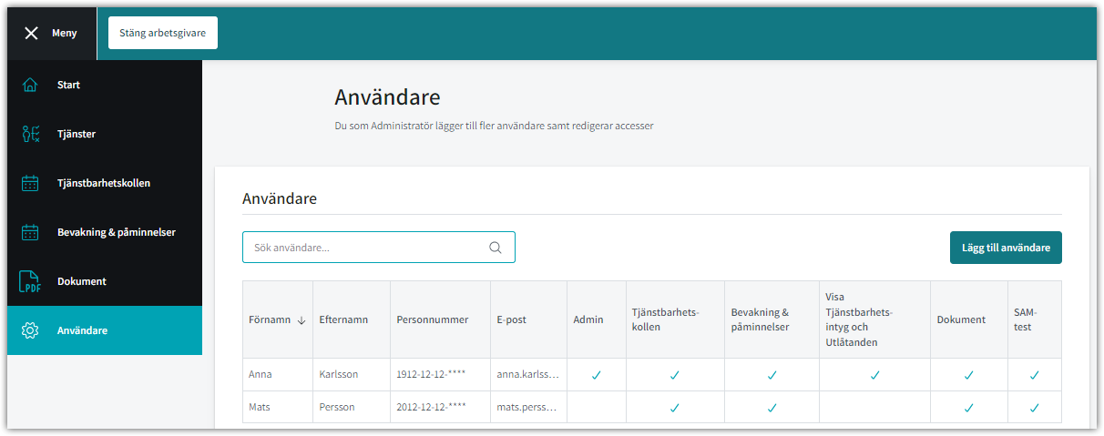Endast Plustoo-ansvarig ser Användare i menyn. Plustoo-ansvarig bestämmer vem/vilka medarbetare hos arbetsgivaren som ska ha tillgång till Arbetsgivarkontot, samt vilka accesser respektive medarbetare ska ha. Se mer i Plustoo-ansvarig för Arbetsgivarkontot - lägg till användare och accesser.