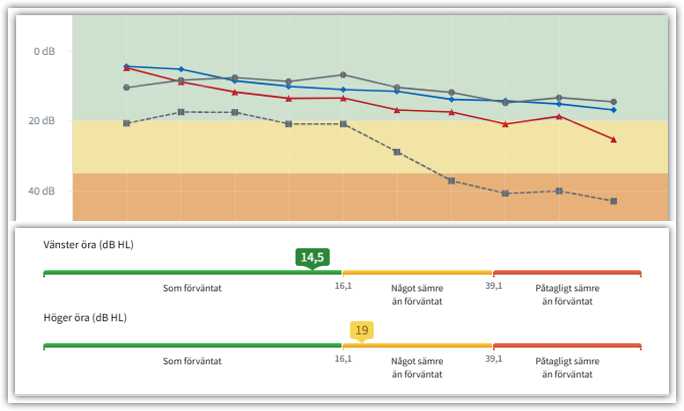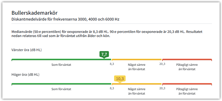 - I Plustoo och på Hälsokontot presenteras istället vilken screeningnivå deltagaren hörde, för egen jämförelse mot referensvärdena.