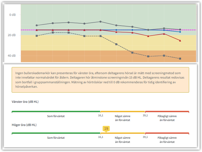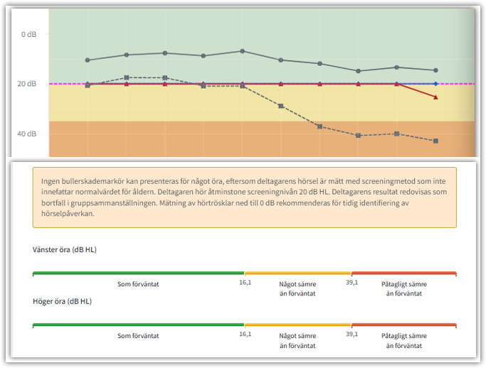 Vid screeningaudiometri där deltagarens hörtröskel är HÖGRE än screeningnivån, kan resultat presenteras på samma sätt som om Hörtröskelbestämning till/från 0 dB använts (då deltagarens exakta hörtrösklar fastställts). Bullerskademarkören presenteras då i Plustoo, på Hälsokontot och i grupprapporten utifrån vad som är förväntat utifrån ålder och kön