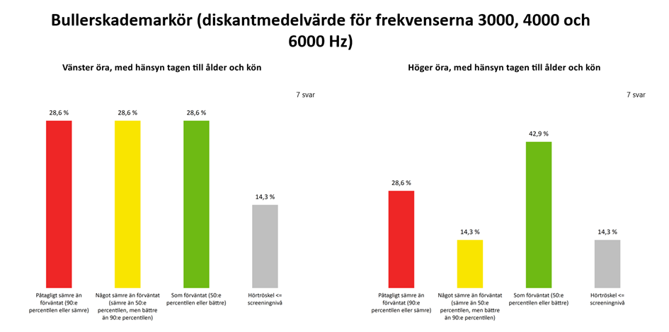 - Bullerskademarkörer kan inte presenteras för något öronen eftersom hörtrösklar = screeningnivån 20 dB (mätningen innefattade inte nog låga ljudnivåer gör att fastställa deltagarens exakta hörtrösklar på något öra).